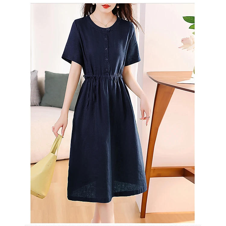 Đầm linen nữ trơn tay ngắn kết hợp phối cúc và rút eo , có nhiều màu dễ mặc đi chơi hay đi làm Da217
