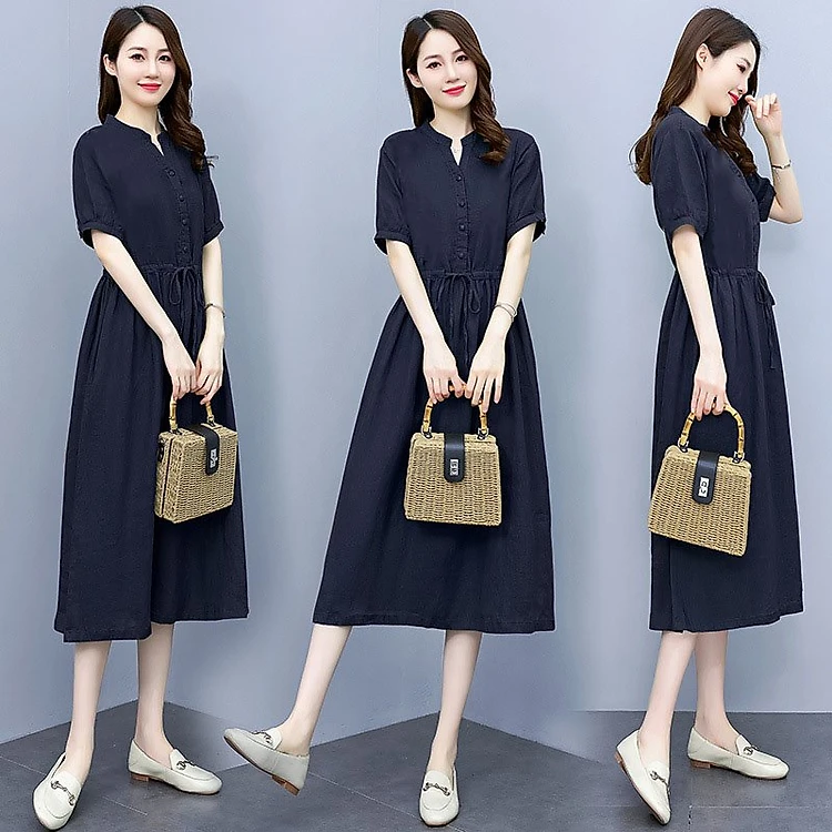 Đầm linen suông cổ phát V, tay ngắn có dây rút eo, phong cách công sở cho nữ Haint Boutique