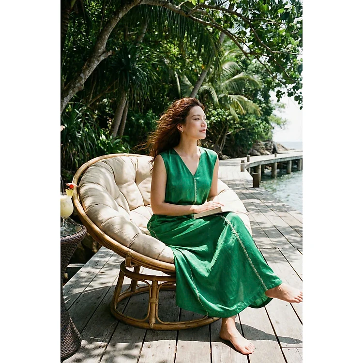 Đầm Maxi Lụa Tơ Tằm Thêu Tay Xanh Ngọc Phỉ Thuý DRE202 thời trang thiết kế Hity