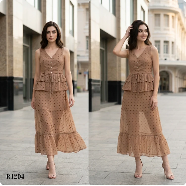 Đầm Maxi Ruzimay Chấm Bi Voan Áo Váy Rời Dáng Dài R1200