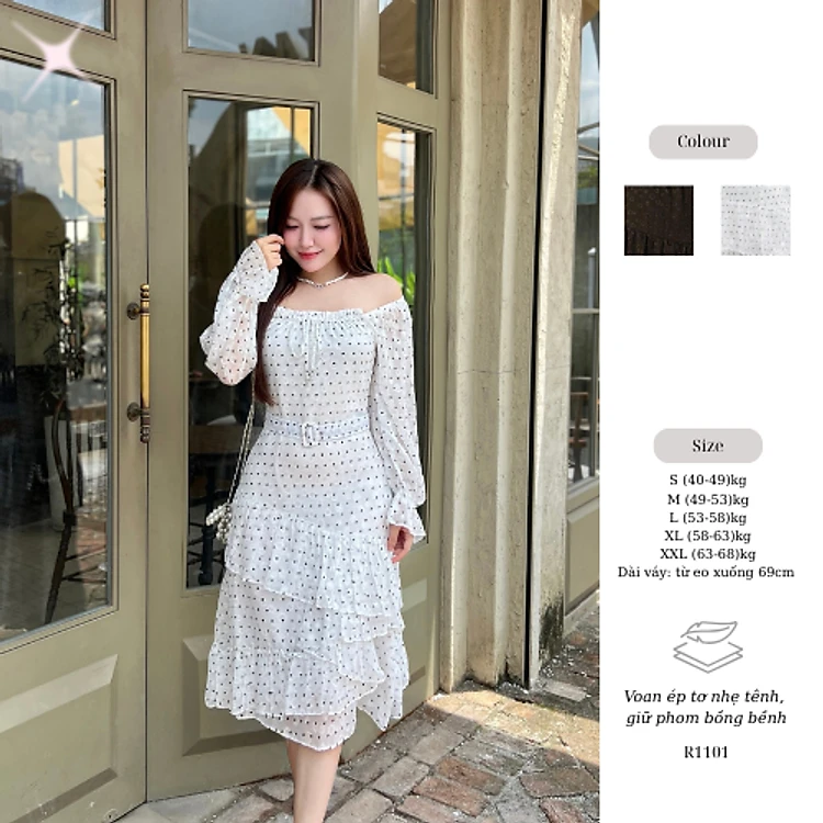 Đầm Maxi Ruzimay Trễ Vai Chấm Bi Dáng Dài Xếp Tầng R1100