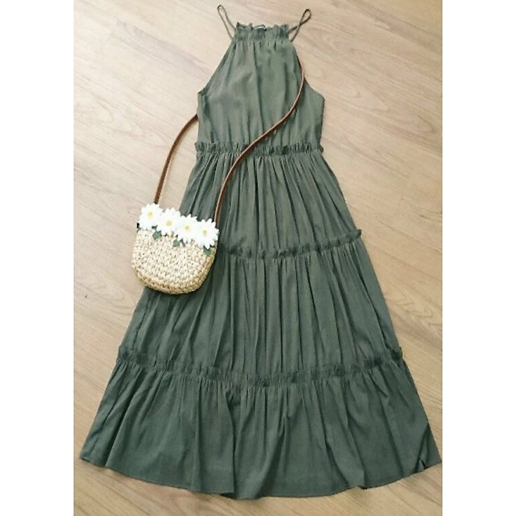 đầm maxi xanh rêu cổ yếmXDS205