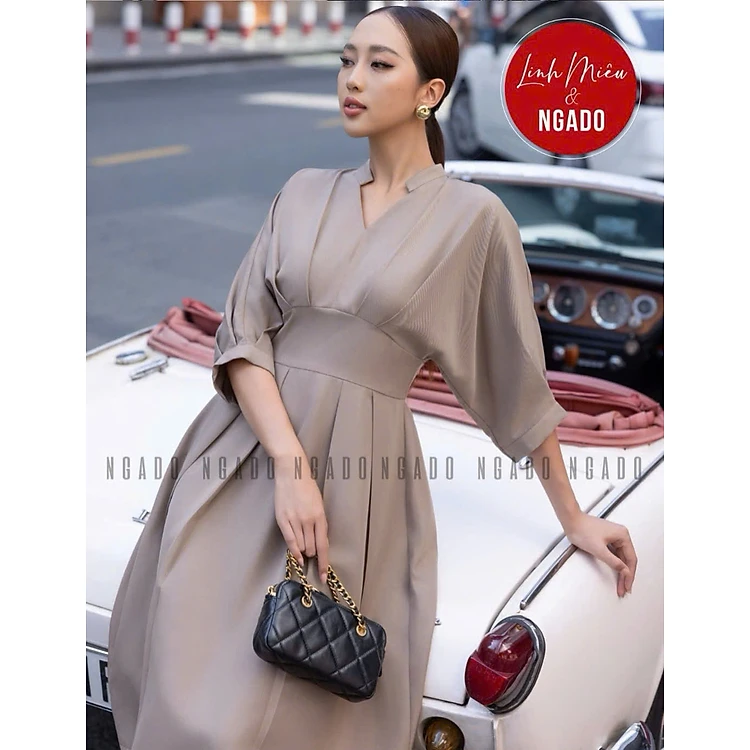 Đầm nâu cổ trụ xếp ly NGADO , đầm kiểu Nữ , đầm công sở , đầm dự tiệc