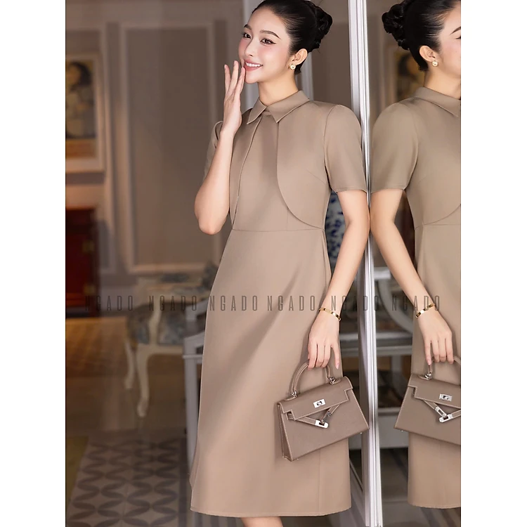 Đầm nâu sơ mi ngắn tay NGADO , đầm kiểu sơ mi , đầm công sở, dự tiệc
