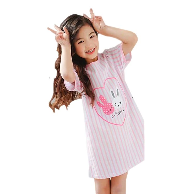 Đầm suông tay ngắn đáng yêu Họa tiết sọc hồng với 2 chú thỏ làm điểm nhấn