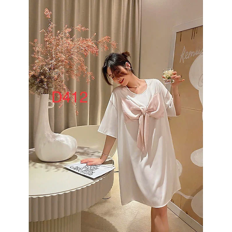 Đầm Ngủ D412 Lụa Quảng Châu Cao Cấp Mẫu Trơn Đơn Giản Đính Nơ Xinh Xắn