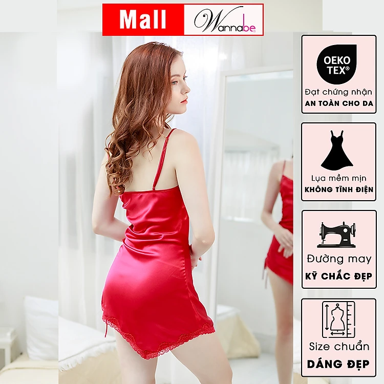 Đầm ngủ lụa WANNABE DNS57 váy ngủ 2 dây phối ren lượn sóng tại cổ, dây rút nhúng 1 bên hông khoe chân dài đẹp gợi cảm