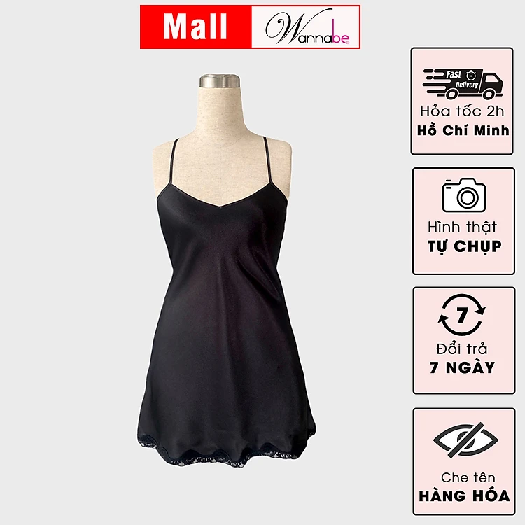 Đầm ngủ phi lụa cao cấp WANNABE DNS14 váy ngủ 2 dây kiểu dáng đơn giản nhẹ nhàng chân váy viền ren lai chăm sóc giấc ngủ
