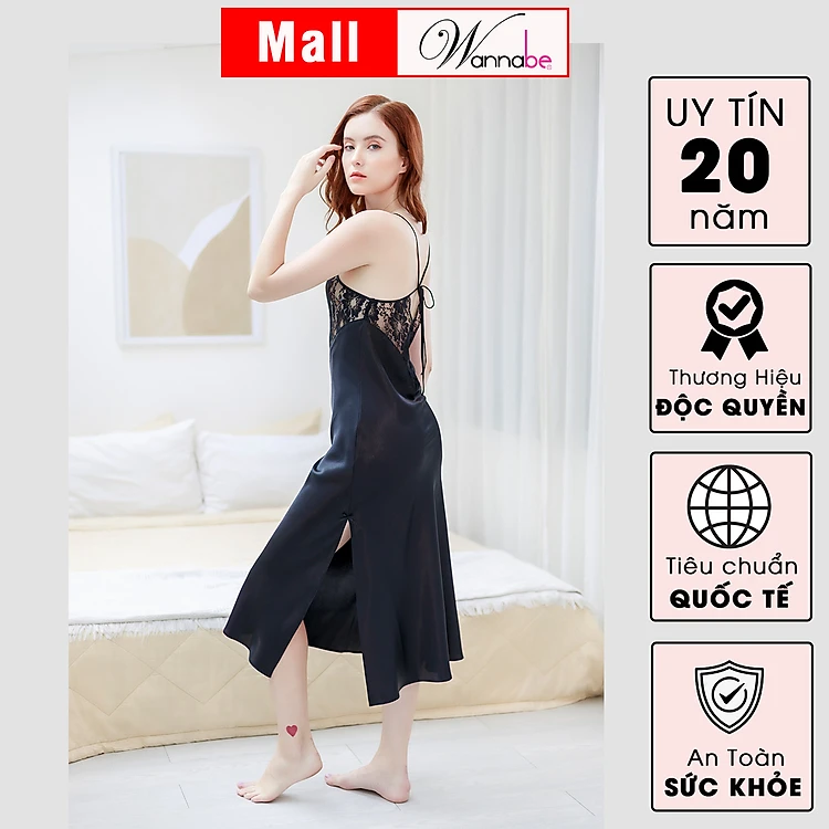 Đầm ngủ phi lụa cao cấp Wannabe DNS25 váy ngủ dài phối ren thân trên cột nợ quyến rũ quý phái