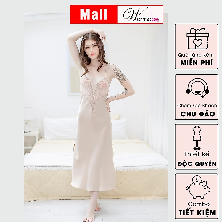 Đầm ngủ phi lụa cao cấp Wannabe DNS25 váy ngủ dài phối ren thân trên cột nợ quyến rũ quý phái