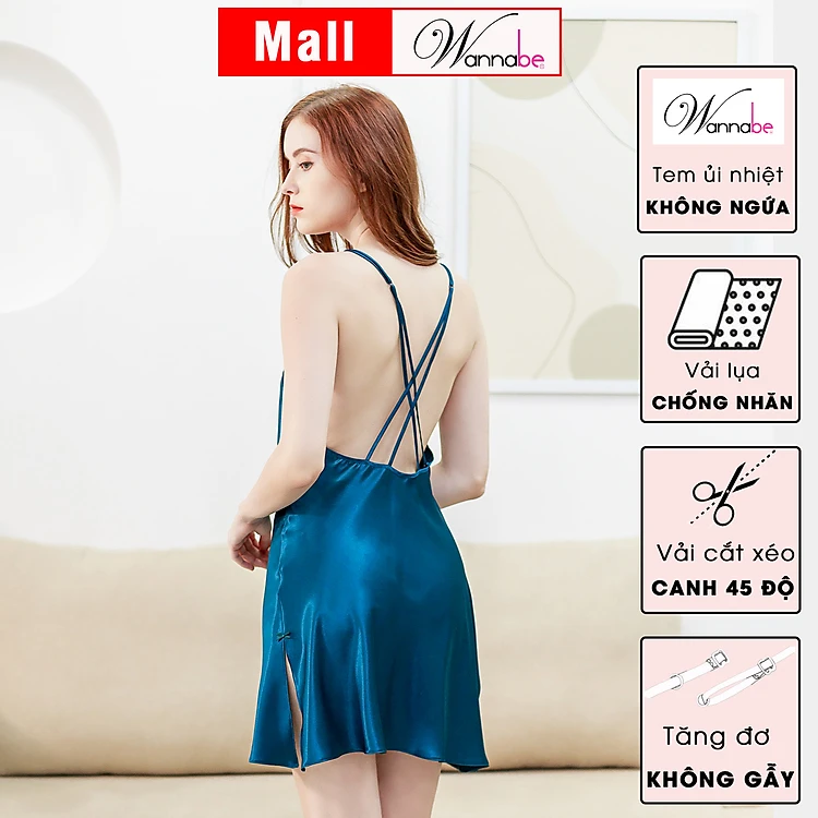 Đầm ngủ WANNABE DNS31 váy ngủ lụa 2 dây, cổ đổ sang trọng, 4 dây lưng đan chéo quyến rũ ánh nhìn người đối diện