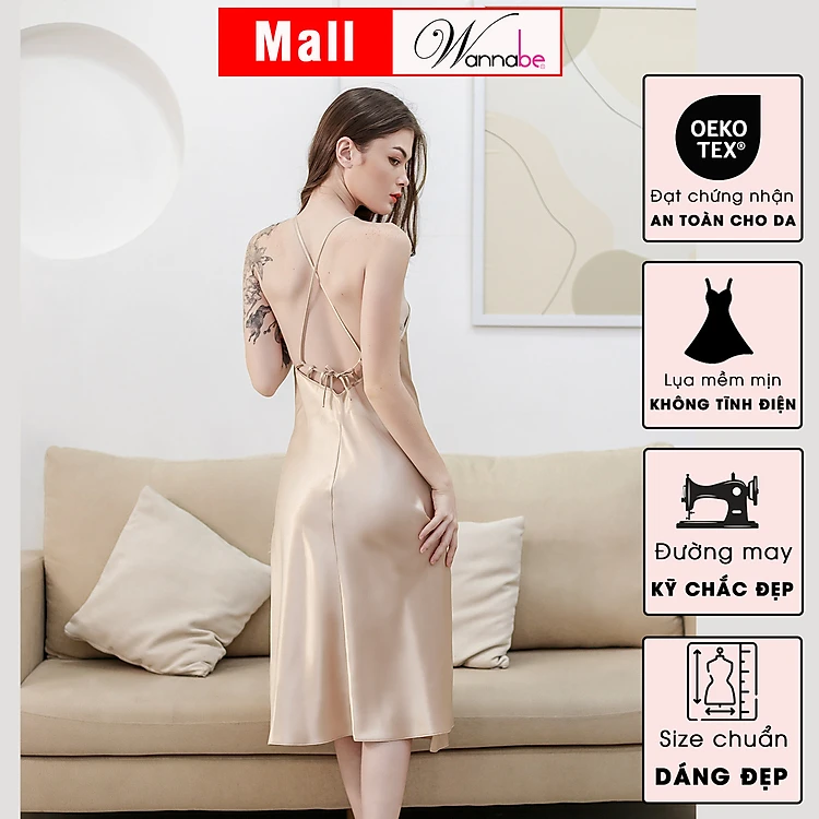 Đầm ngủ phi lụa cao cấp WANNABE DNS34 váy ngủ cổ yếm dáng dài sang trọng quý phái nữ tính với lưng đan dây thắt nơ xinh