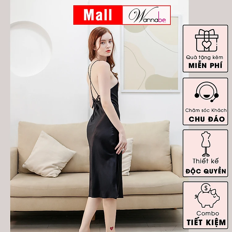 Đầm ngủ phi lụa cao cấp WANNABE DNS34 váy ngủ cổ yếm dáng dài sang trọng quý phái nữ tính với lưng đan dây thắt nơ xinh