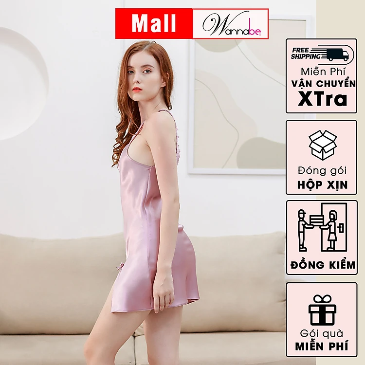 Đầm ngủ lụa WANNABE DNS43 váy ngủ 2 dây cổ yếm lưng phối ren xinh xắn, xẻ 2 giữa 2 đùi làm tăng nét nữ tính quyến rũ của bạn gái