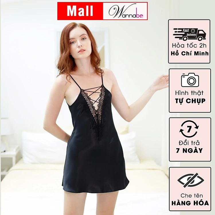 Đầm ngủ phi lụa cao cấp Wannabe DNS52 cổ chữ V xẻ sâu đan dây ngực quyến rũ gợi cảm