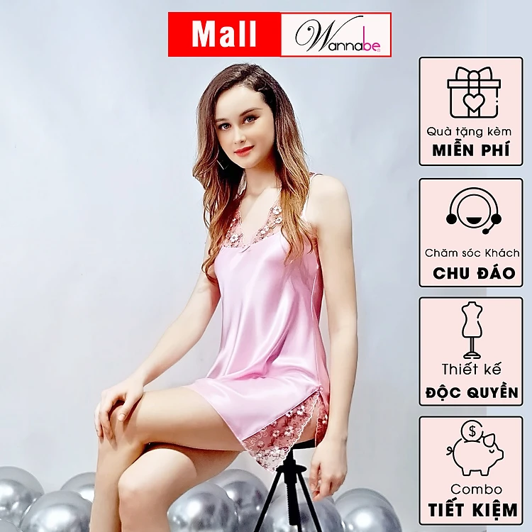 Đầm ngủ phi lụa Wannabe Dns04 cổ phối ren hoa mềm mại, nhẹ nhàng