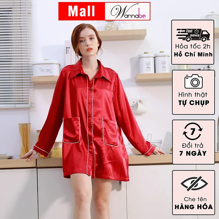 Đầm ngủ sơ mi lụa cao cấp WANNABE DNS44 váy ngủ kiểu dáng pijama rộng rãi thoải mái tay dài viền gân nổi có túi tiện lợi
