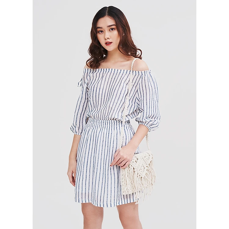 Đầm Nữ Bẹt Vai Rút Dây Sọc Dọc Nhún Eo SS19 Marc Fashion