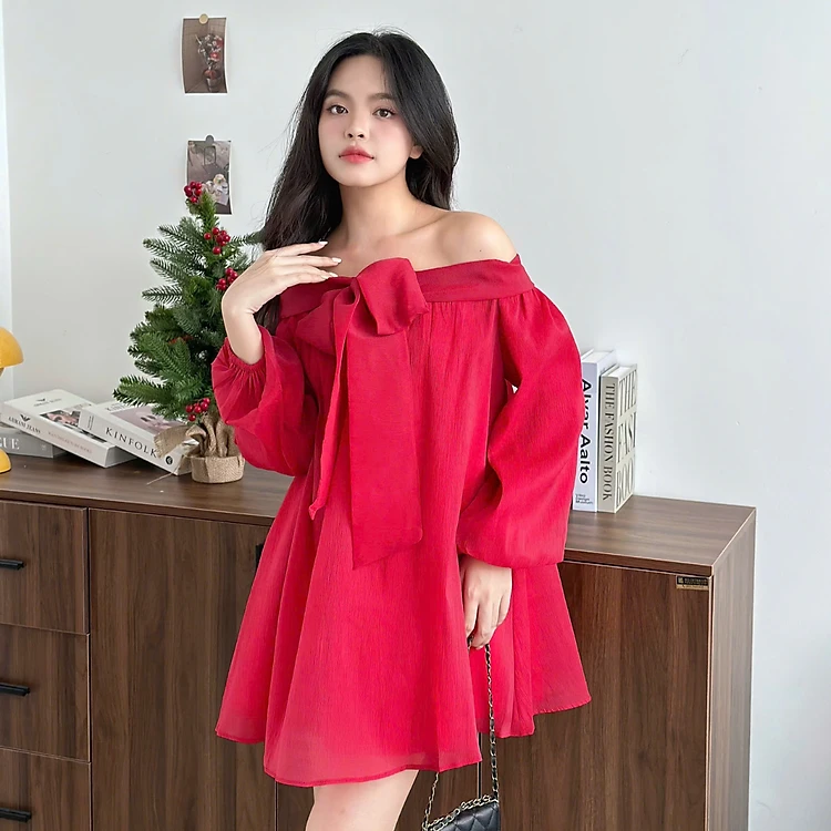 Đầm nữ dài tay kiểu dáng trễ vai chất tơ nến Blossom Miều Est.2013