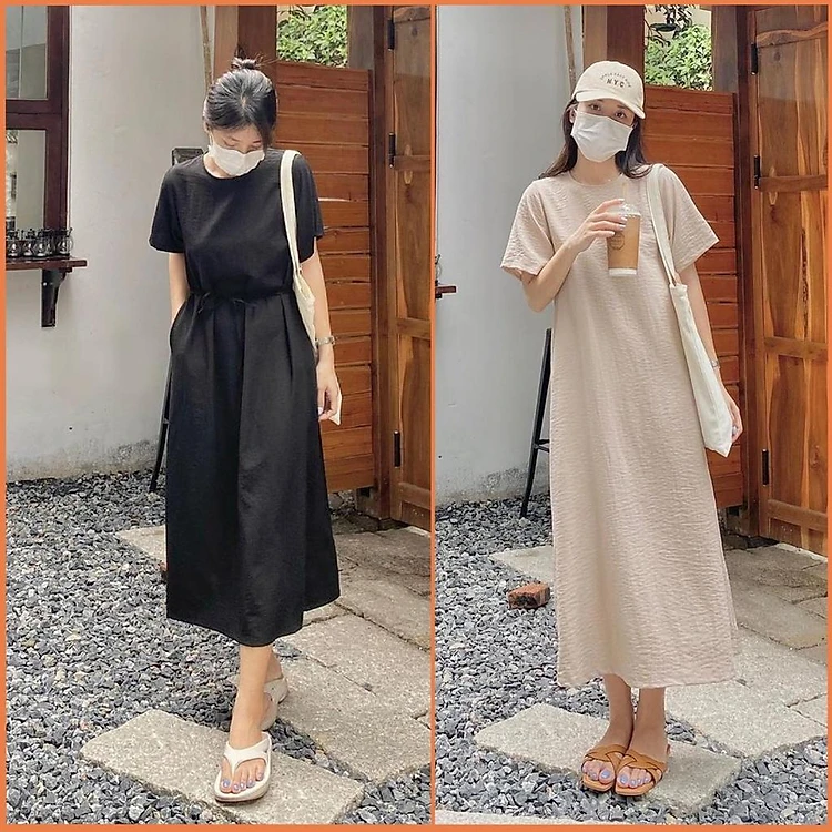 Đầm nữ dáng dài form rộng - Váy suông dài trơn, thắt eo vintage V-TS