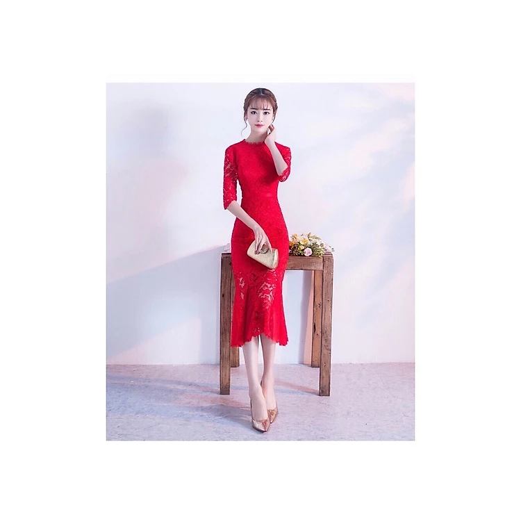 Đầm ôm body đuôi cá tay lửng ren đỏ