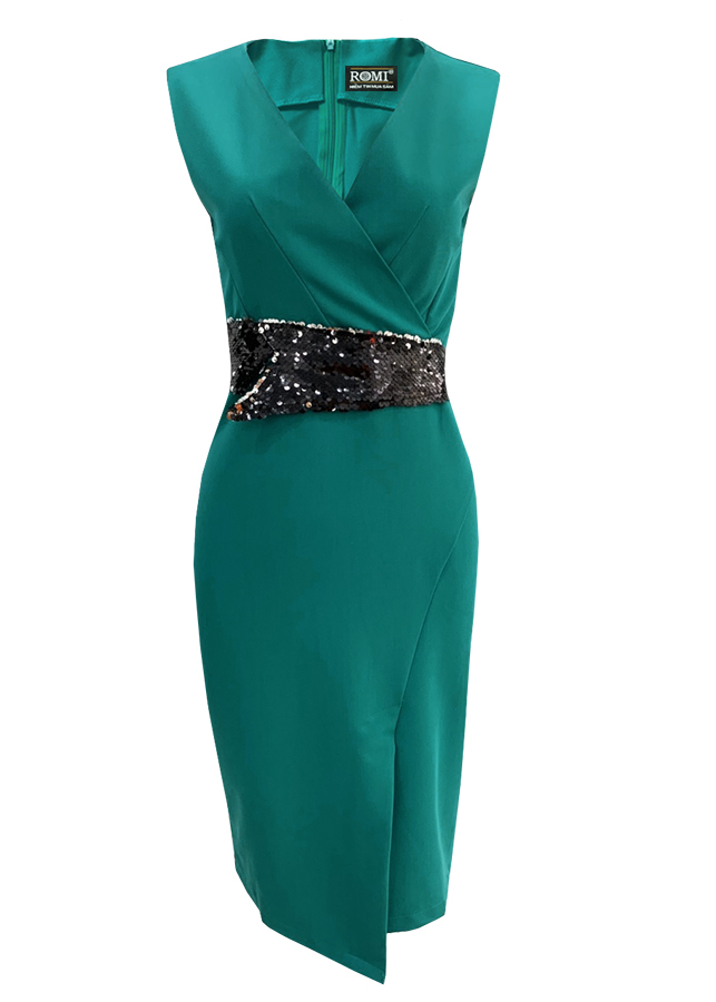 ĐẦM ÔM CỔ ĐẮP CHÉO PHỐI KIM SA EO XẺ TÀ TRƯỚC D3043