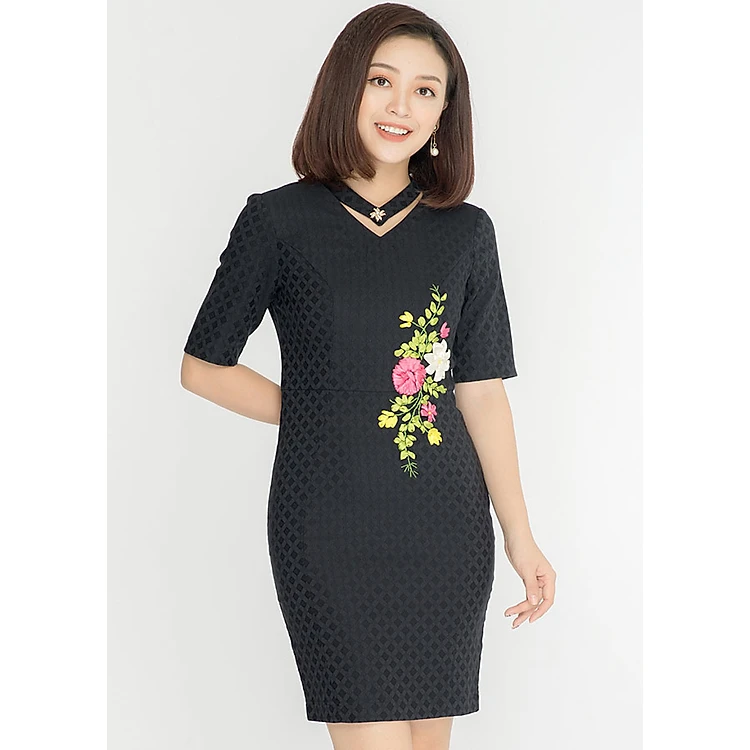 • Dáng ôm body mang đến đường cong quyến rũ. Cổ V rời đính đá tinh tế, hoa thêu ruy băng tạo điểm nhấn.