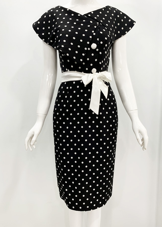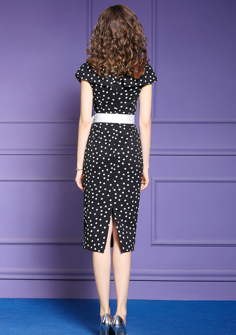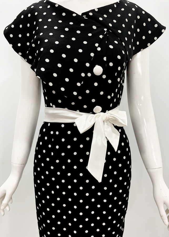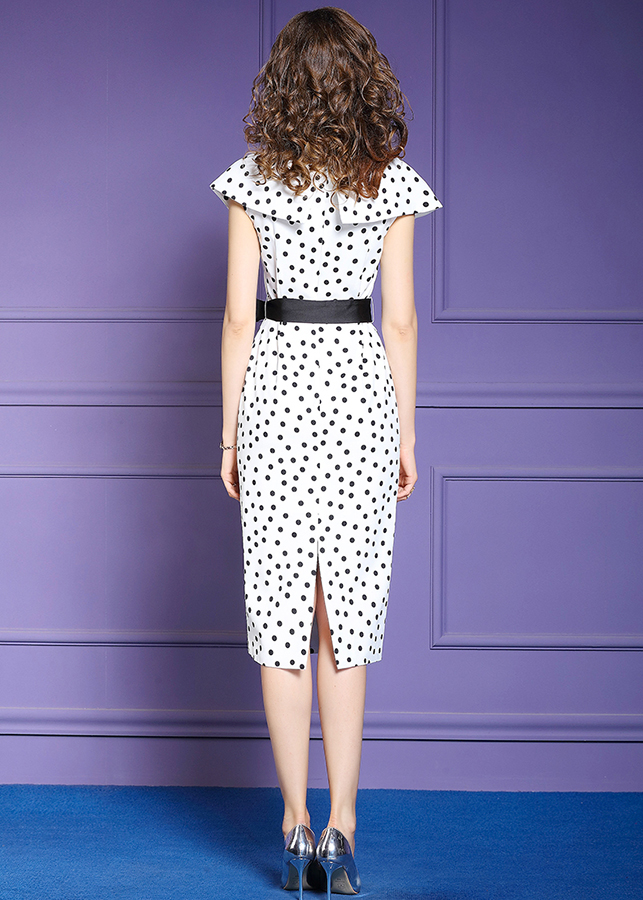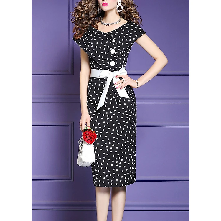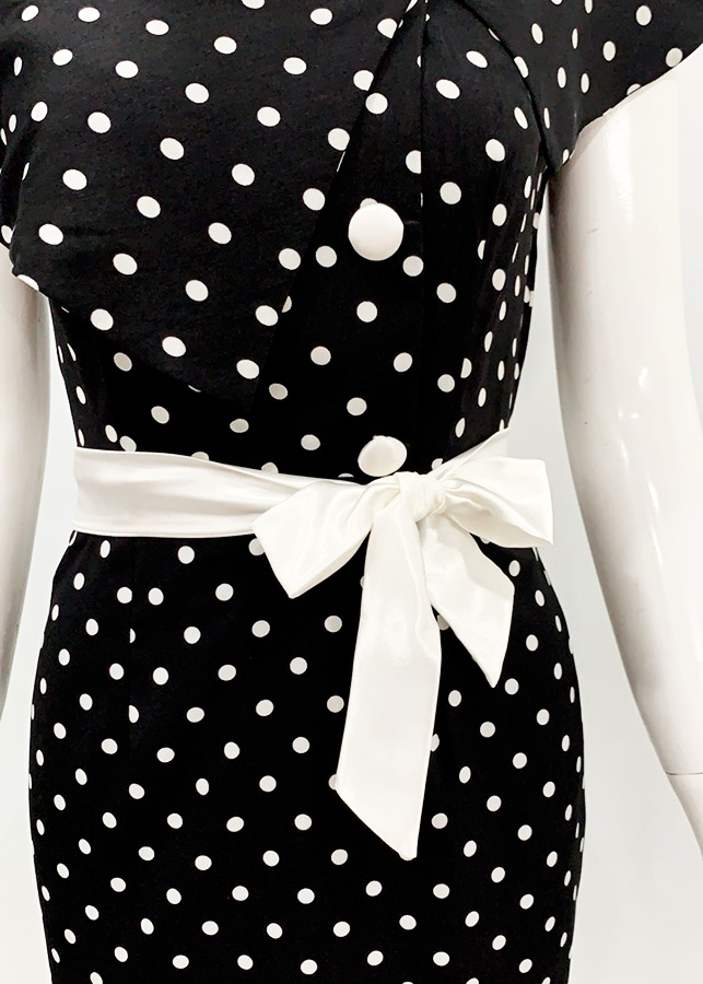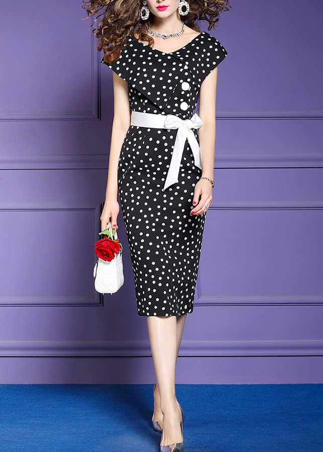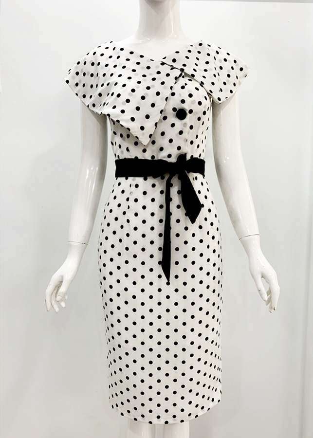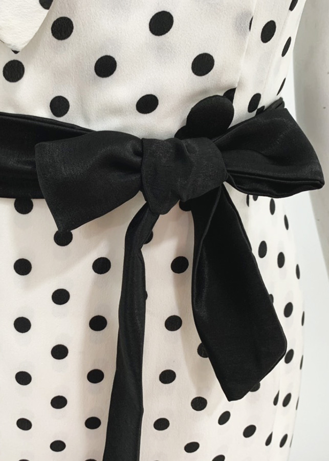 · Thiết kế dáng đầm ôm chấm bi phối nút bọc, kèm thắt nơ rời, cổ áo cách điệu, chất liệu không co giãn nhưng vẫn tạo được cảm giác thoải mái.
