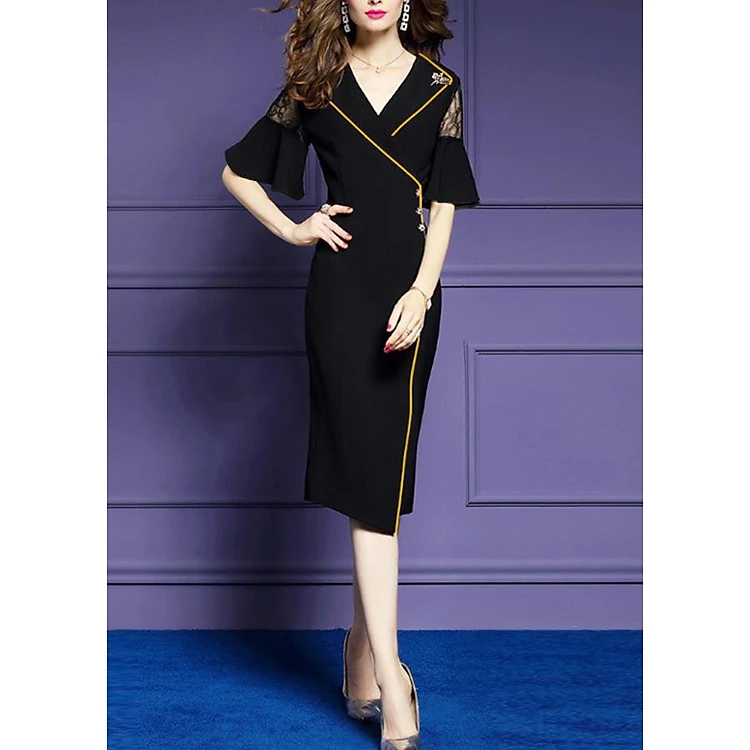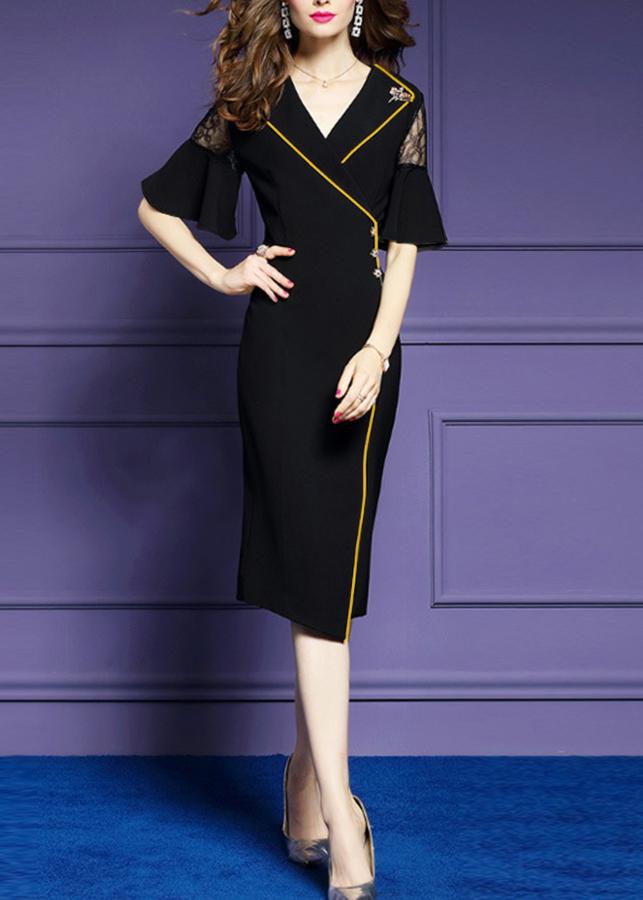 • Thiết kế dáng đầm ôm phối ren viền màu, tay loe, kèm phụ kiện ngẫu nhiên, chất liệu co giãn tạo được cảm giác thoải mái.