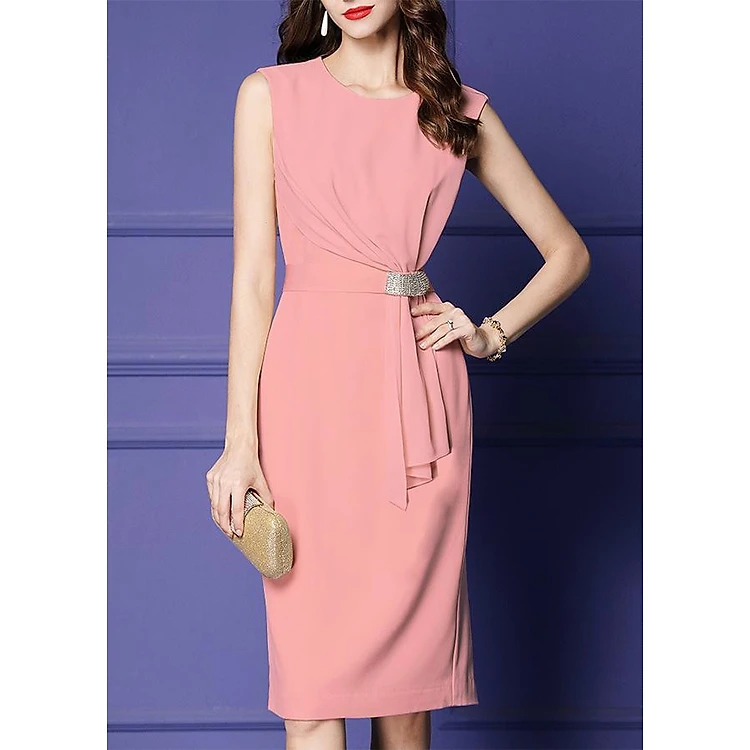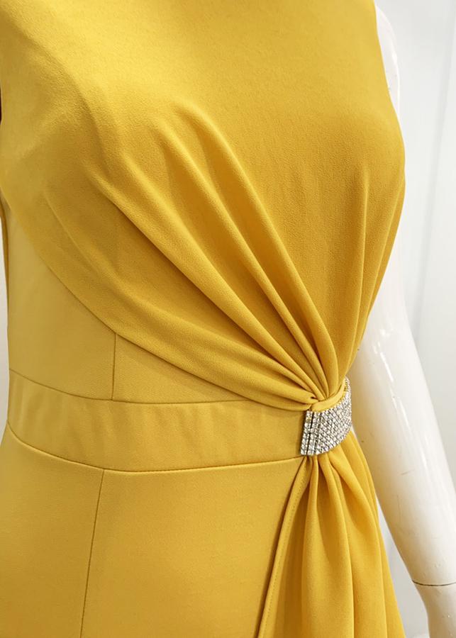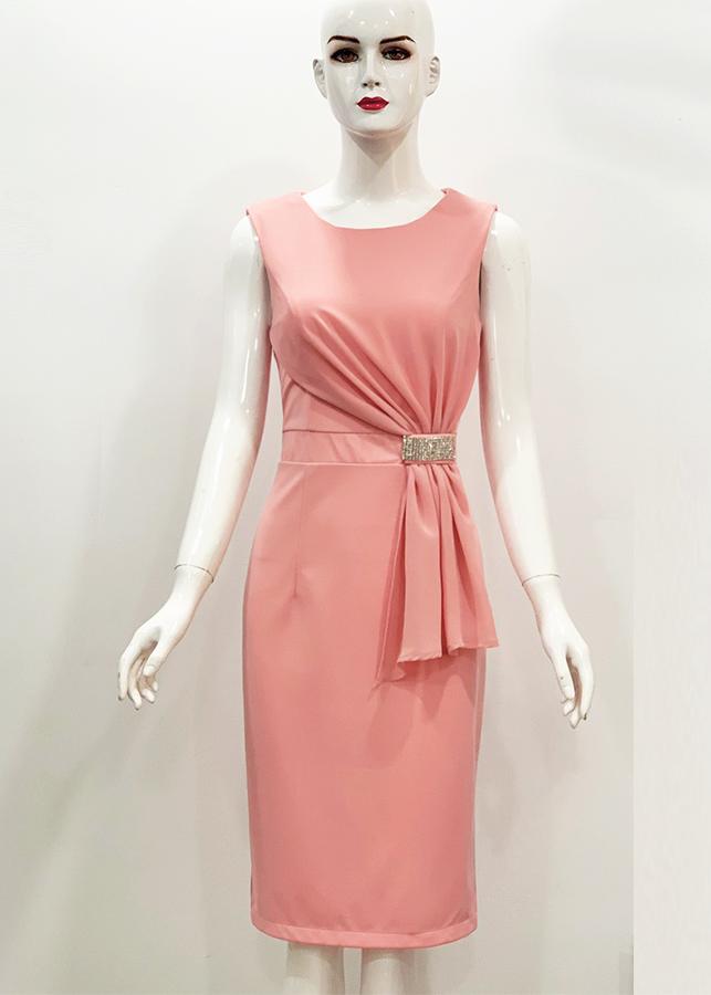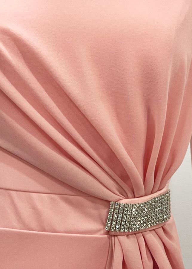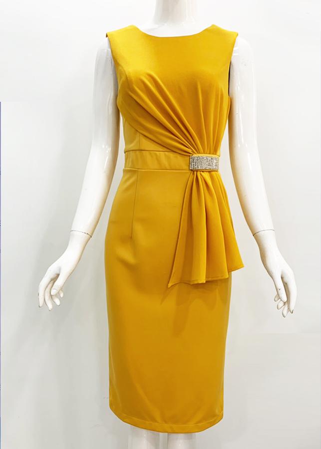 - Thiết kế dáng đầm ôm phối voan cách điệu eo đính đá, chất liệu co giãn tạo được cảm giác thoải mái.