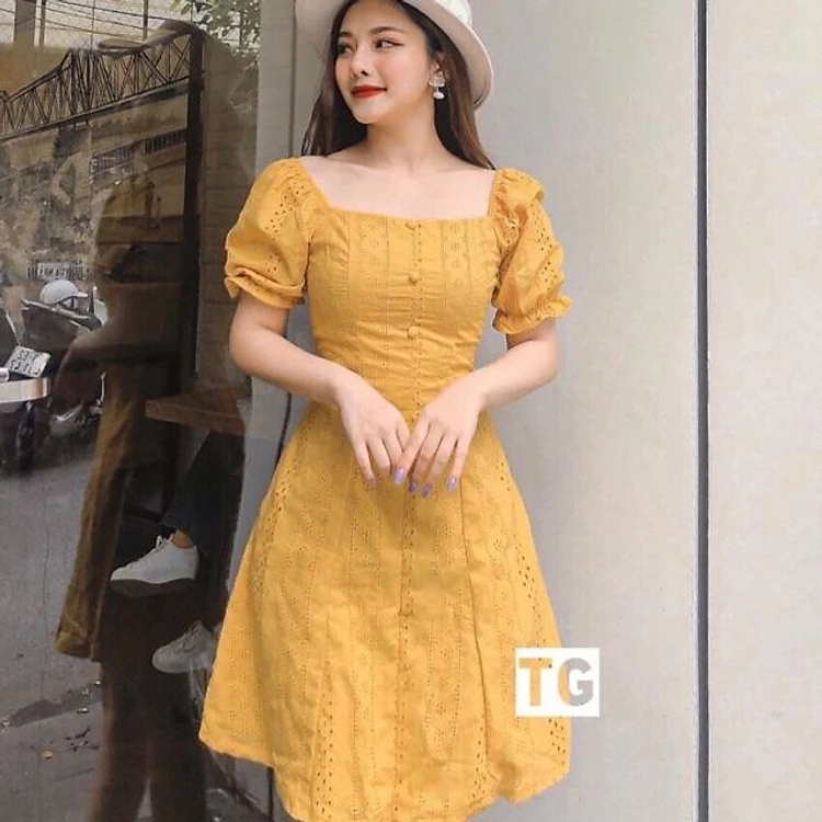Đầm QC cao cấp thô thêu cổ vuông tay bồng