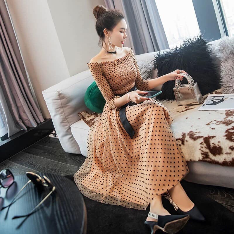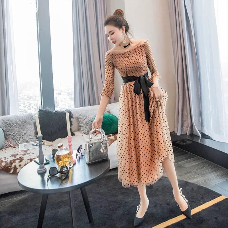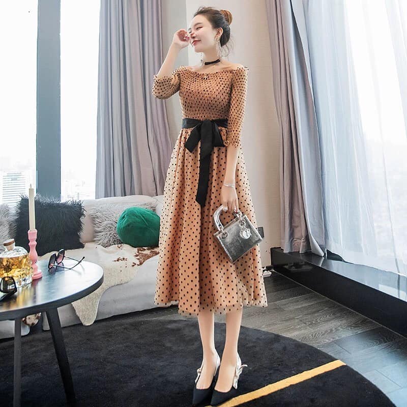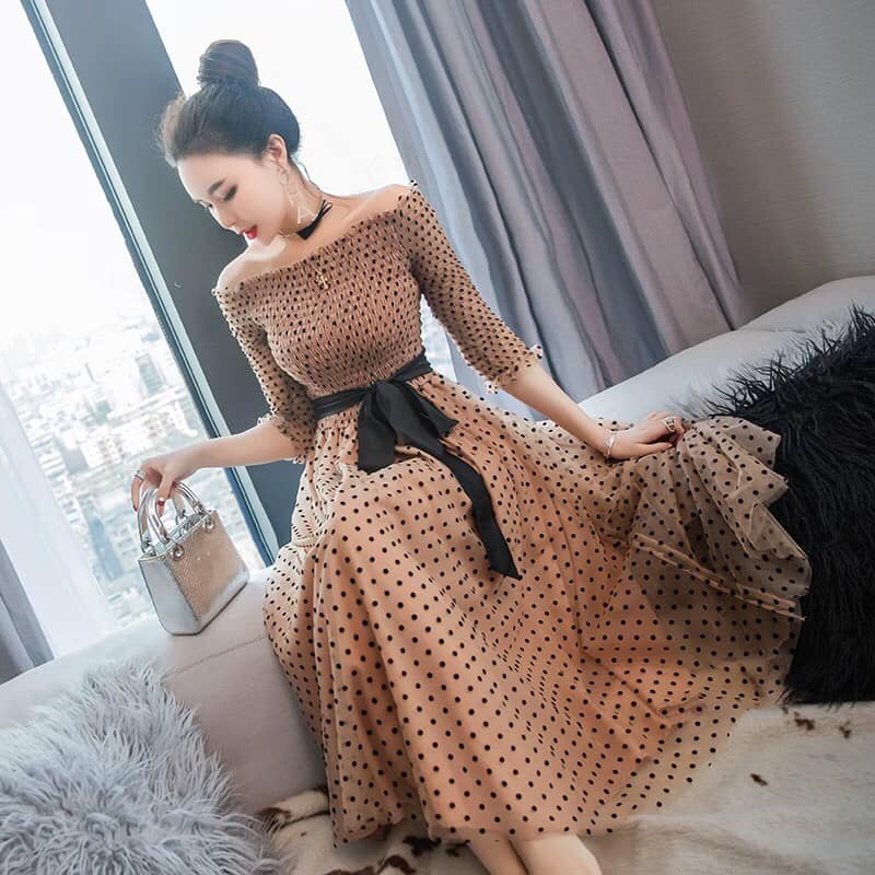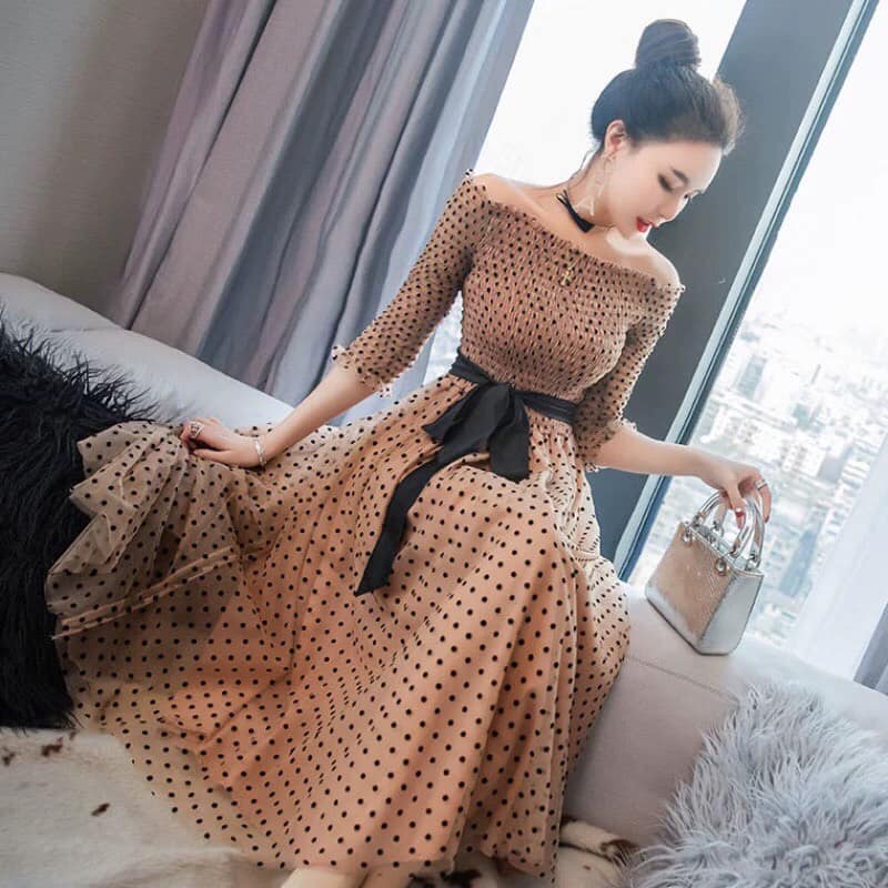 [HÀNG NHẬP] ĐẦM REN LỤA CHẤM BI BẸT VAI CAO CẤP