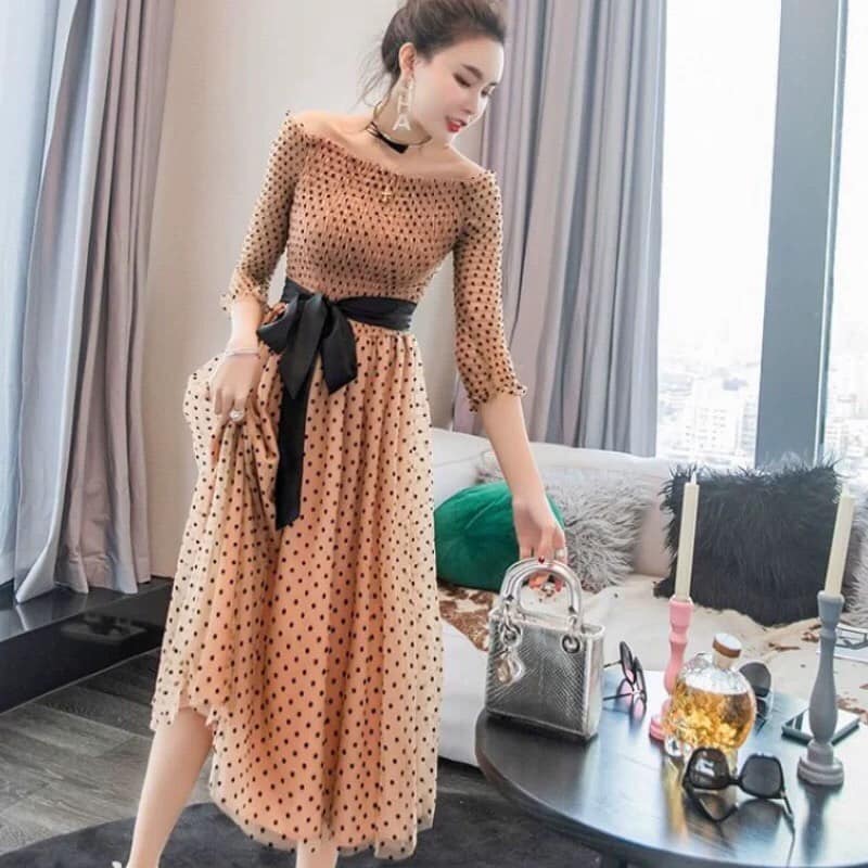 ĐẦM REN LỤA CHẤM BI BẸT VAI CAO CẤP