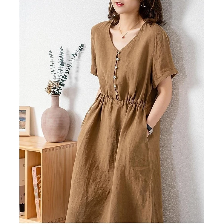 Đầm sơ mi cổ V màu trơn thanh lịch cho nữ, Đầm suông linen nhún eo, ngắn tay mặc đi làm, đi chơi Haint Boutique Da173