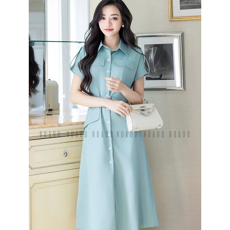 Đầm sơ mi xanh mint NGADO , đầm công sở , đầm dự tiệc
