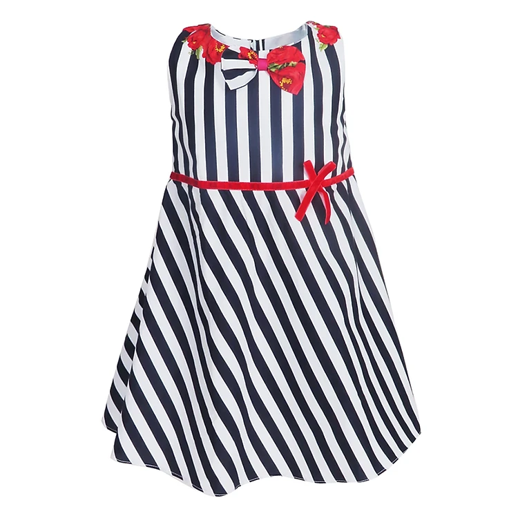 - Áo sát nách, cổ tròn có đính nơ tạo điểm nhấn, phần váy xòe nhẹ giúp bé trở nên xinh xắn.