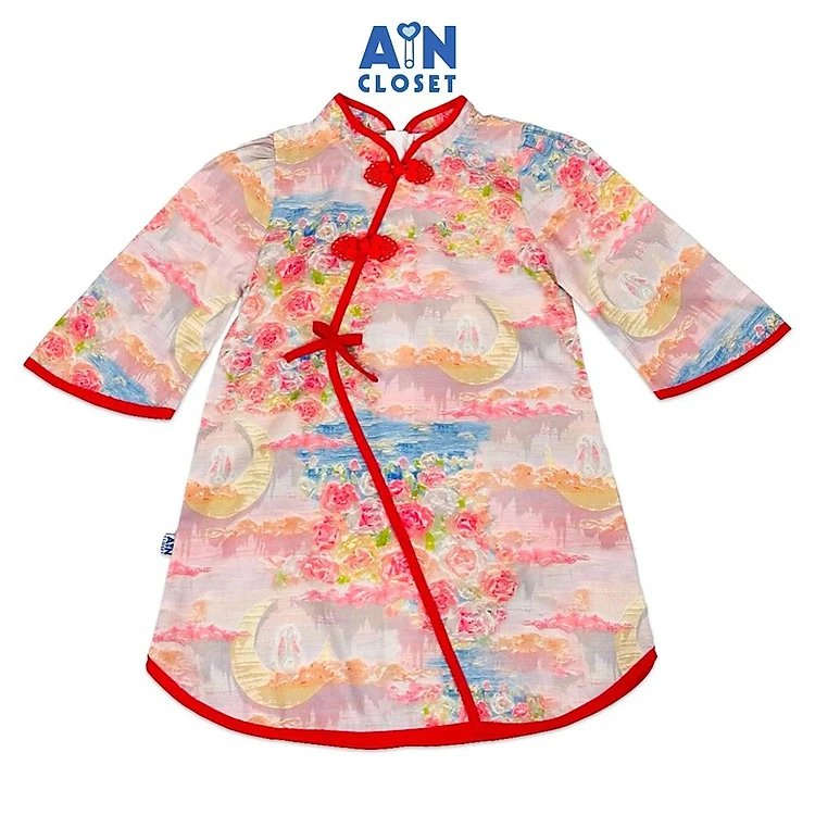 Đầm Sườn xám bé gái họa tiết Thỏ Mặt Trăng viền đỏ cotton - AICDBTWLJTC2 - AIN Closet