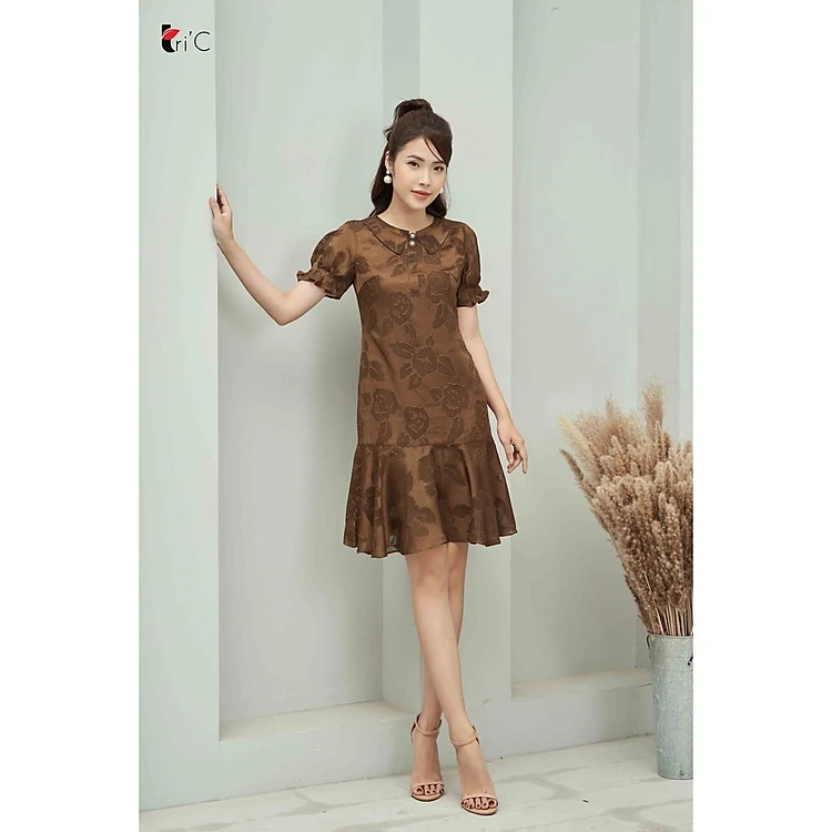 Đầm suông cổ sen đính ngọc, hoa chìm , gấy bèo Tri'C Luxury A24621 Nâu tây