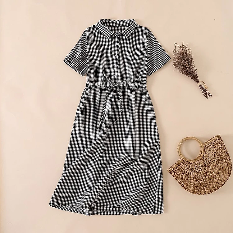 Đầm suông kẻ sọc cổ sơ mi Linen kèm đai thắt eo, chất vải linen tự nhiên, thời trang phong cách Hàn Da73