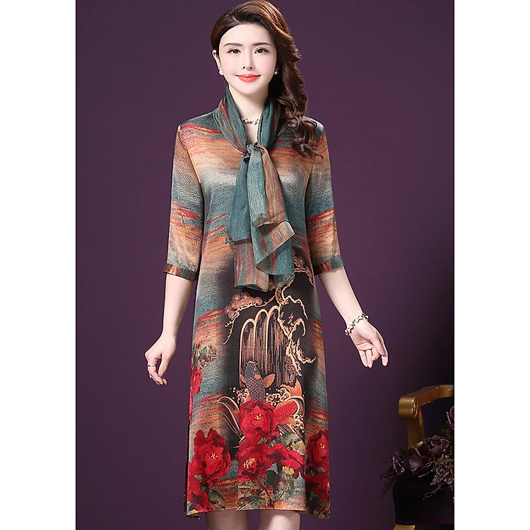 Thiết kế dáng đầm suông qua gối, cổ V kèm khăn rời nữ tính quyến rủ, đầm suông rộng nên che khuyết điểm vòng eo thật tinh tê