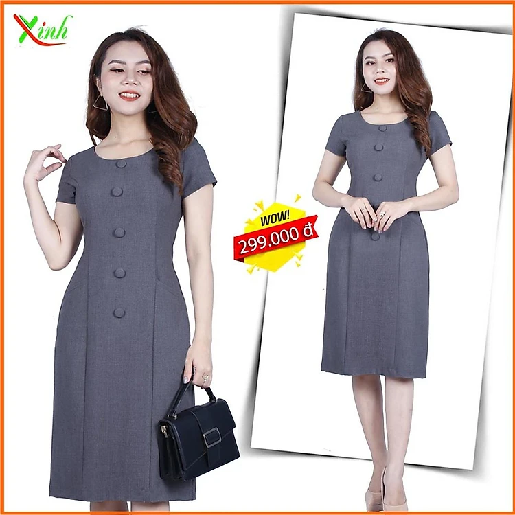 Đầm Suông Xám Tiêu Phối Nút Sang Trọng DL508