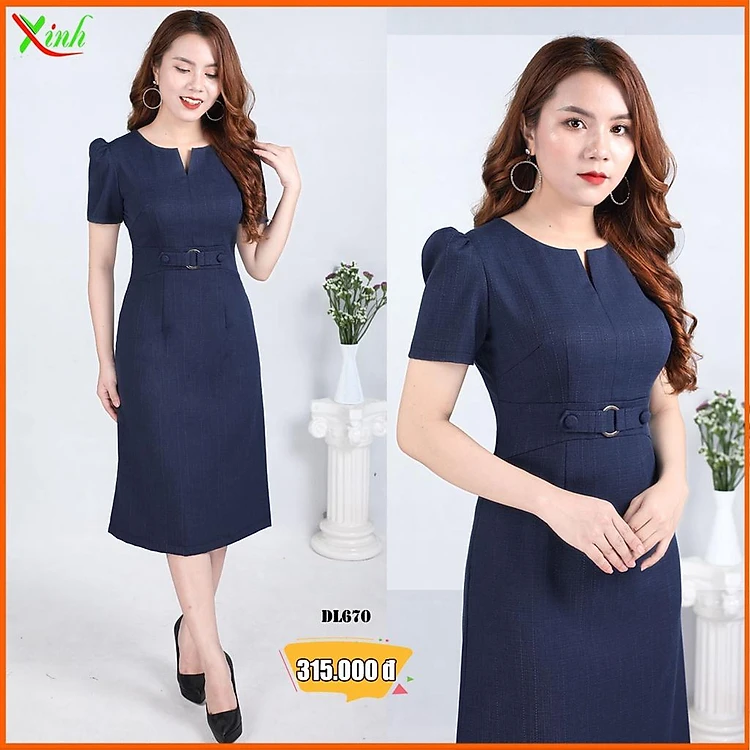 Đầm Suông Xanh Đen Phối Khuy Che Bụng Béo DL670