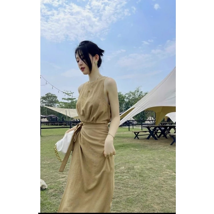 Đầm tà đắp buộc nơ eo sát nách dáng dài