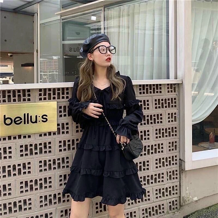 ĐẦM TẦNG TAY DÀI DÁNG XOÈ TIỂU THƯ MÀU ĐEN