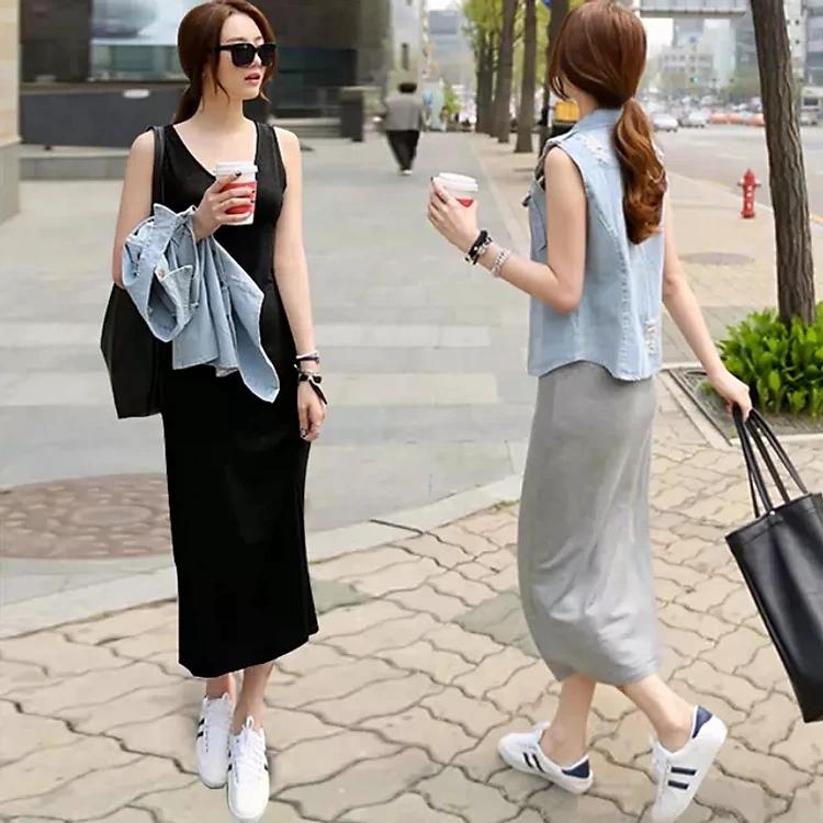 Đâm thun co giãn 4 chiều, đầm suông trơn dáng dài 120cm, phong cách basic nhẹ nhàng HB17