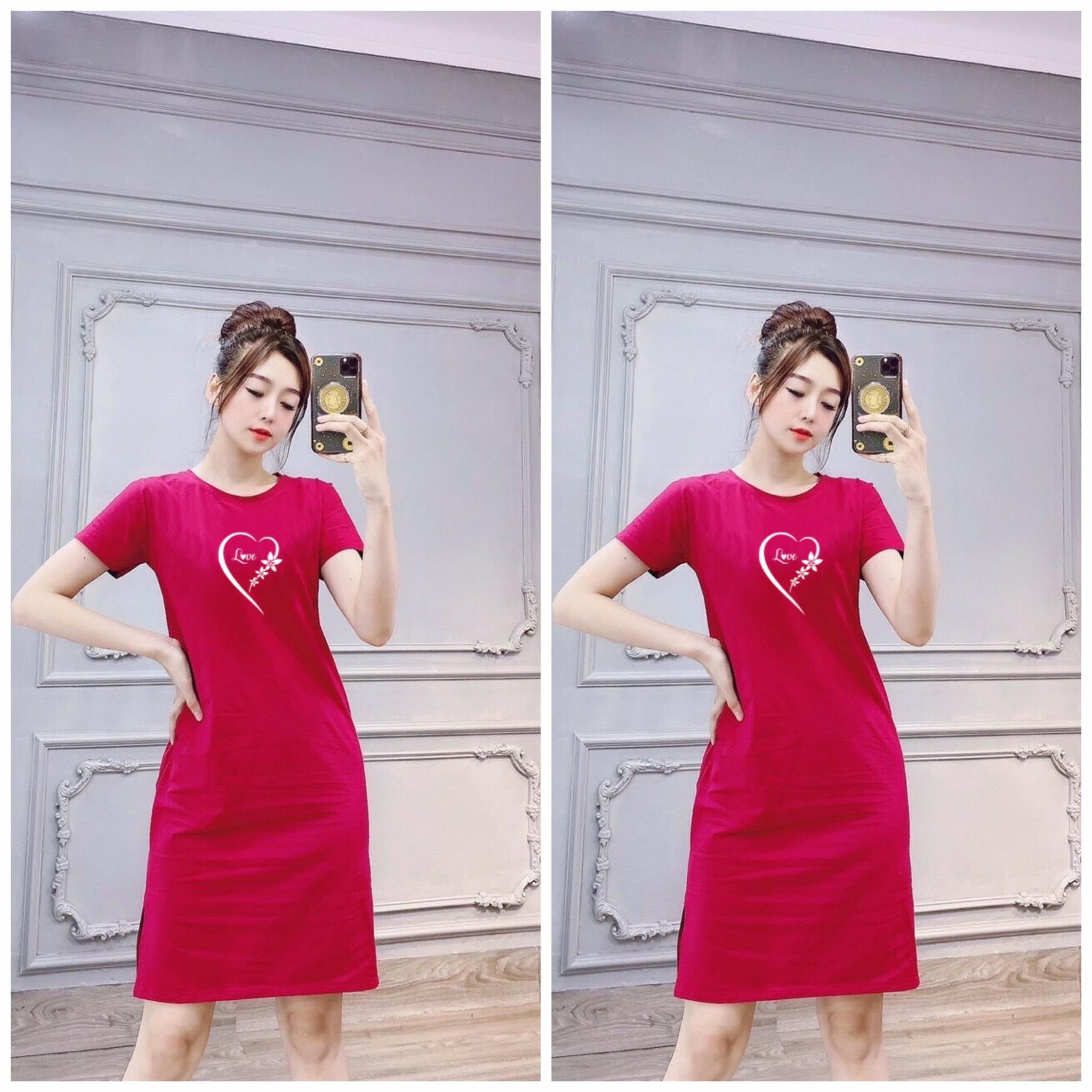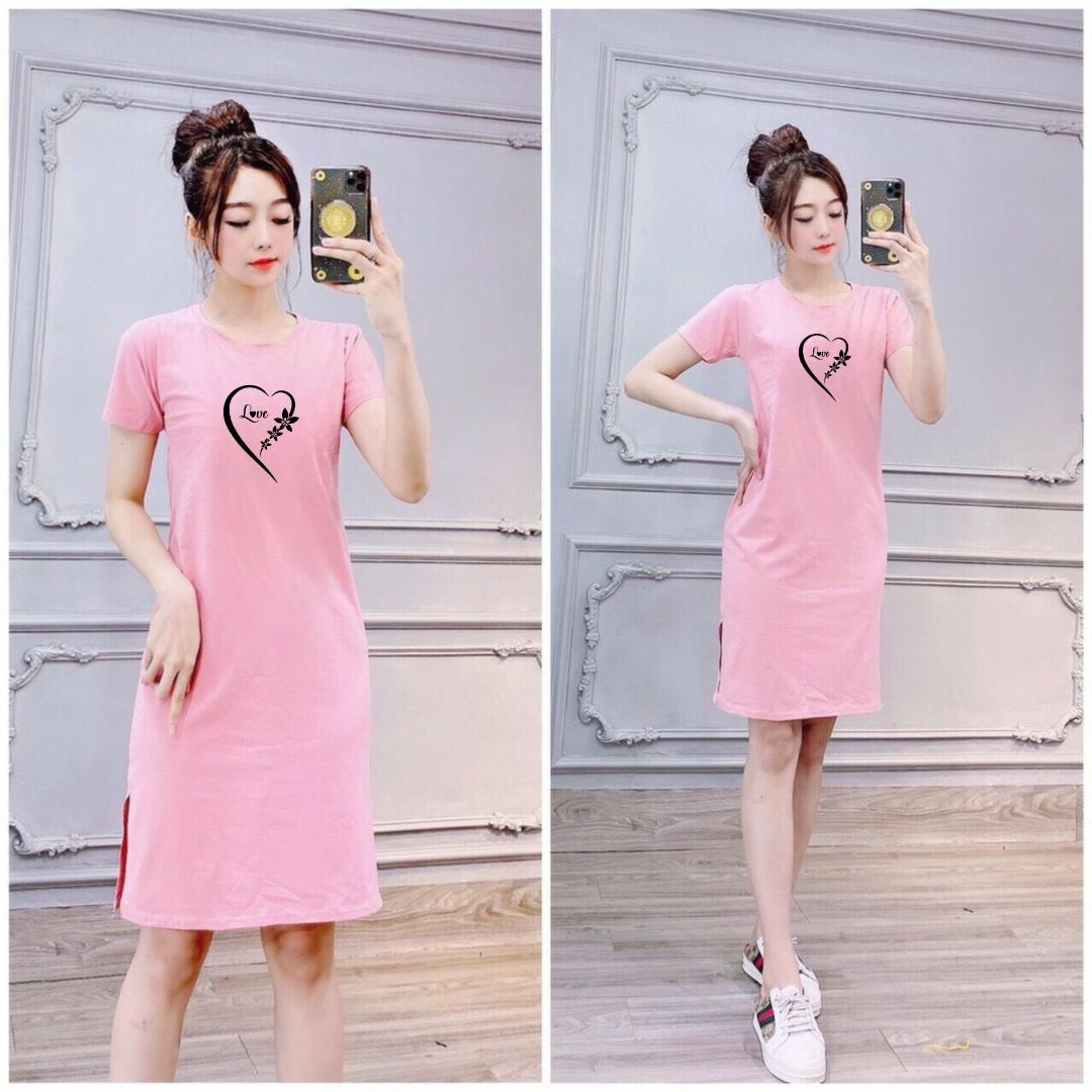 Đầm thun dáng suông cổ tròn xẻ tà in hình dễ thương thun cotton 4 chiều từ 40-55kg ( D161 )