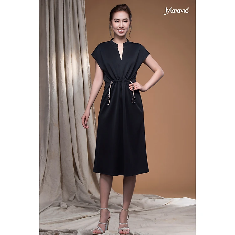 Đầm thun đen cổ sơmi tim, rút dây Maxivic LM062405 [BST Da Beo]
