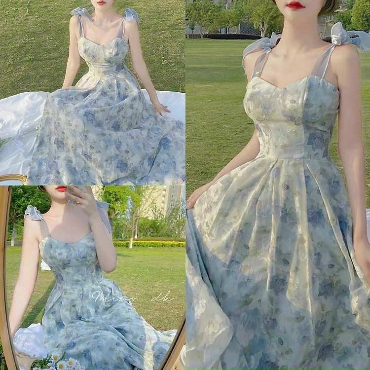 Đầm váy nữ 2 dây cột voan hoa màu xanh nhẹ nhàng, đằm thắm thích hợp cho các nàng đi chơi, đi biển
