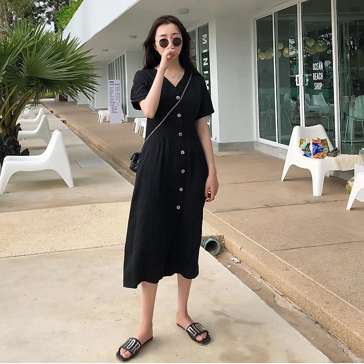 Đầm váy nữ sơ mi dáng dài, cổ chữ V cài cúc ngắn tay phong cách trẻ trung cho nữ Haint Boutique Da194