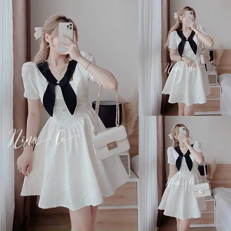 Đầm váy nữ trắng xốp kết nơ xinh xắn, cute dành cho các tiểu thư đi chơi, dạo phố